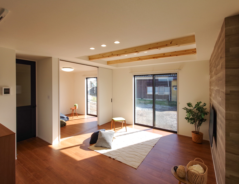 直近の暮らしかたはもちろん効率的に考えましたが。この家では将来の暮らしのことも考え1階だけで、生活を完結できるようにLDKには隣接した部屋を設けています。将来のご夫婦の寝室です。玄関からも直行できて、開け放てばリビングを延長するように広く使える。お子さまの遊びスペースとしてお友達を呼んだ時や、ご両親がお泊りに来たときにもちょうどいい。使い勝手の良い、LDKをより広い空間にしてくれる、そんなプランをご採用いただきました。