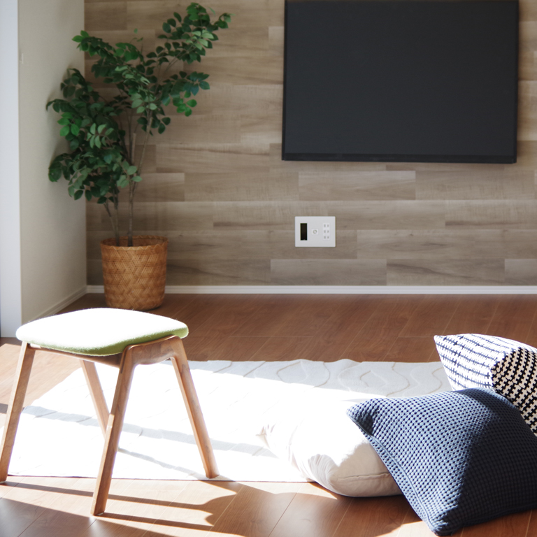 リビングは背の高いバスケットプレーヤーのご主人に合わせたプランを採用。窮屈さを感じないよう、リビングは天井の多くを17cm高くしています。天井を上げることで現れた梁は、インテリアの1つとなり、高さにアクセントを感じさせます。飾らずとも映えるリビングの完成です。合わせて窓は掃出しタイプを採用。外とつなげることで、空間を開放的に仕上げています。