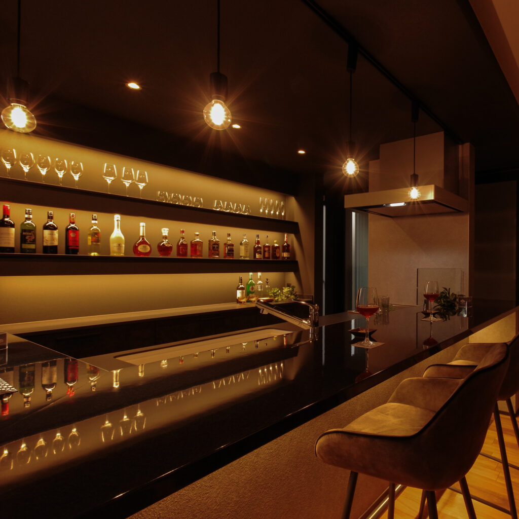 BARそのもののキッチン、シックなインテリア。自分たちらしい発想の家。セミオーダー、コスパとタイパで叶えます。